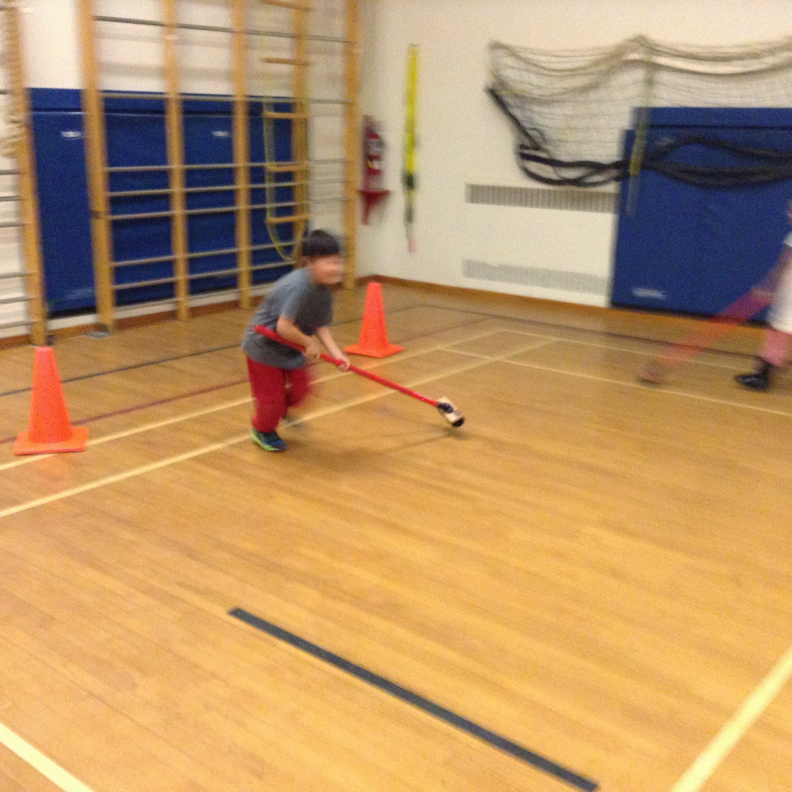 this is a sweeping relay, each person had to hop through the hoops and then sweep across the floor, around a cone and then back to the hoops for more hopping before tagging a teammate for their turn