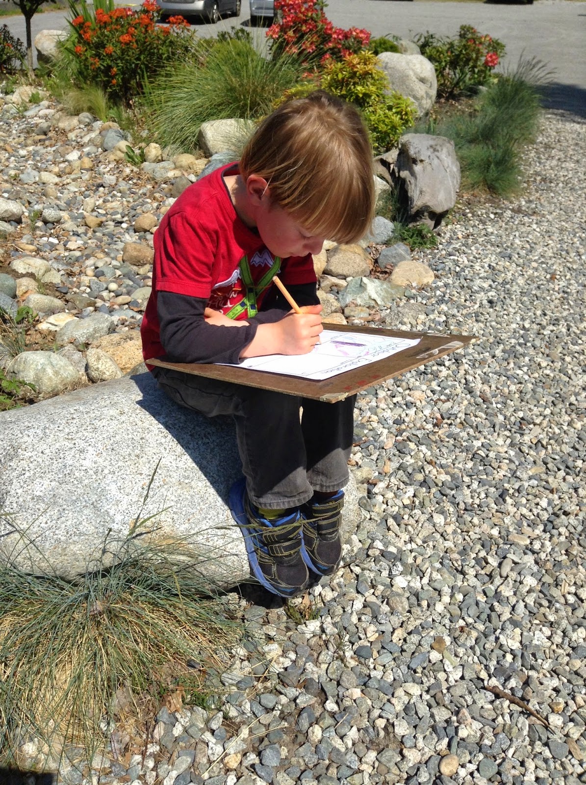 After recess, we took our learning outside again. We went on a senses walk and recorded what we saw and heard. It was such a beautiful day and the flowers in the garden behind Brooksbank were blooming, there was a lot to draw!