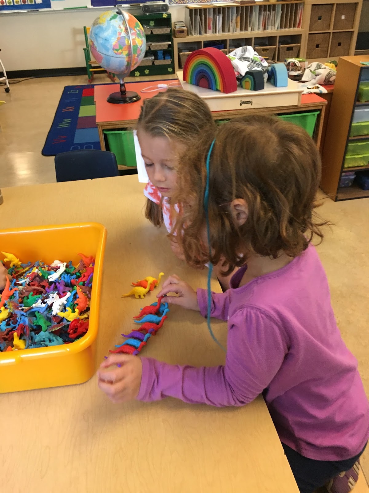 We learned different ways to sort items today and then had lots of time to practice and explore. After we finished sorting, we looked at the following photos together on the TV and guessed each others' sorting rules. We sorted by colour, size, shape, type, texture and thickness, among other things. See if you can guess the sorting rules for these photos. Again, sorry, there are A LOT of photos.